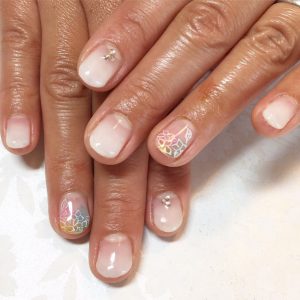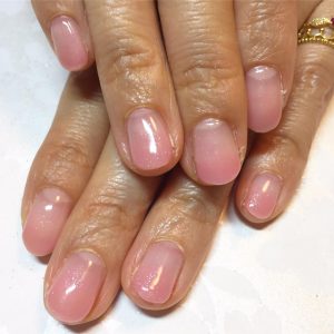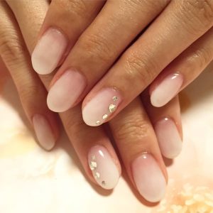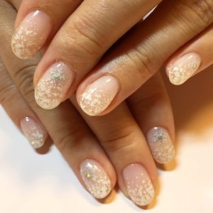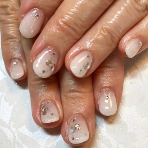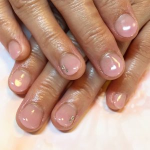 「ナチュラルな感じで」とご相談を頂きました。ほんのり色づくシアーピンクのグラデーションをご提案しましたよ。ラメが入っているので装飾いらずでナチュラルに可愛いです。肌馴染みもいいですね。