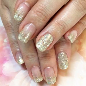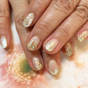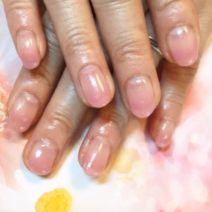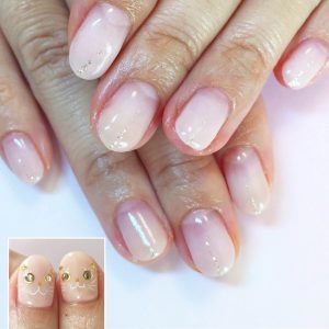 淡いシアーピンクでラメが入っているカラーとグラデーションだと伸びた時も目立たないので合わせてご提案しました。