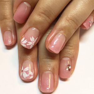 シアリーピンクという細かいラメが入ったカラーを使用しているので、光が当たるとラメがキラキラと自然に輝きます。春らしい桜のアートと、スワロフスキーストーンを組み合わいますよ。ネイルアートの王道でもある花柄は、単色でも可愛いですね。