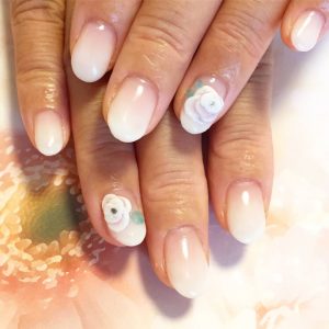 シアーホワイトのグラデーションに、スカルプチュアの材料を使ってお花を作りました。立体感がかわいいです。
