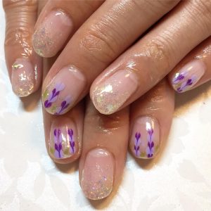 ライトパープルのグラデーションに、フラワーとリーフアート、スワロフスキーストーンをのせています。