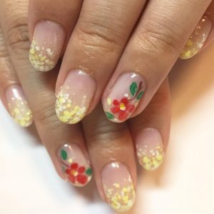 シースルーのお花アートが人気でしたので、そちらをご提案し、イエローとオレンジを使ってアートを作成する事にしました。