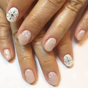 「湖面の雪」という雪が舞っているようなカラージェルと雪の結晶をご提案しました。ラメも入っているので、キラキラと綺麗なデザインに仕上がりました(^^)