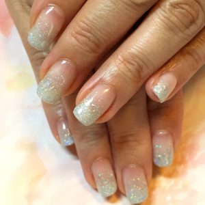「三日月ウサギのティータイム」という、名前から可愛いカラーを使ったグラデーションです。「ホワイトのようなライトグレーのような」というご要望でしたので、こちらのカラーをおすすめしました。ラメが入っているカラーなので装飾いらずです。