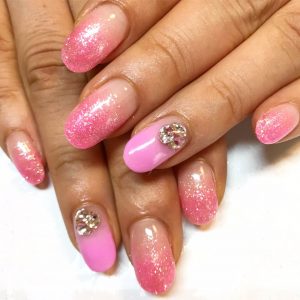 いつもピンク系のネイルをされているお客様です。新しい色味にチャレンジするのは勇気がいると思うので、ピンクでシアー感があり、ラメの入ったカラーをオススメしてみました。