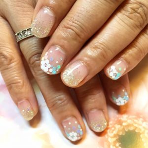 お店に展示してあるデザインサンプルの中から、ホログラムフラワーを気にいって下さり、ゴールドのグラデーションとホログラムのフラワーを合わせる事にしました。